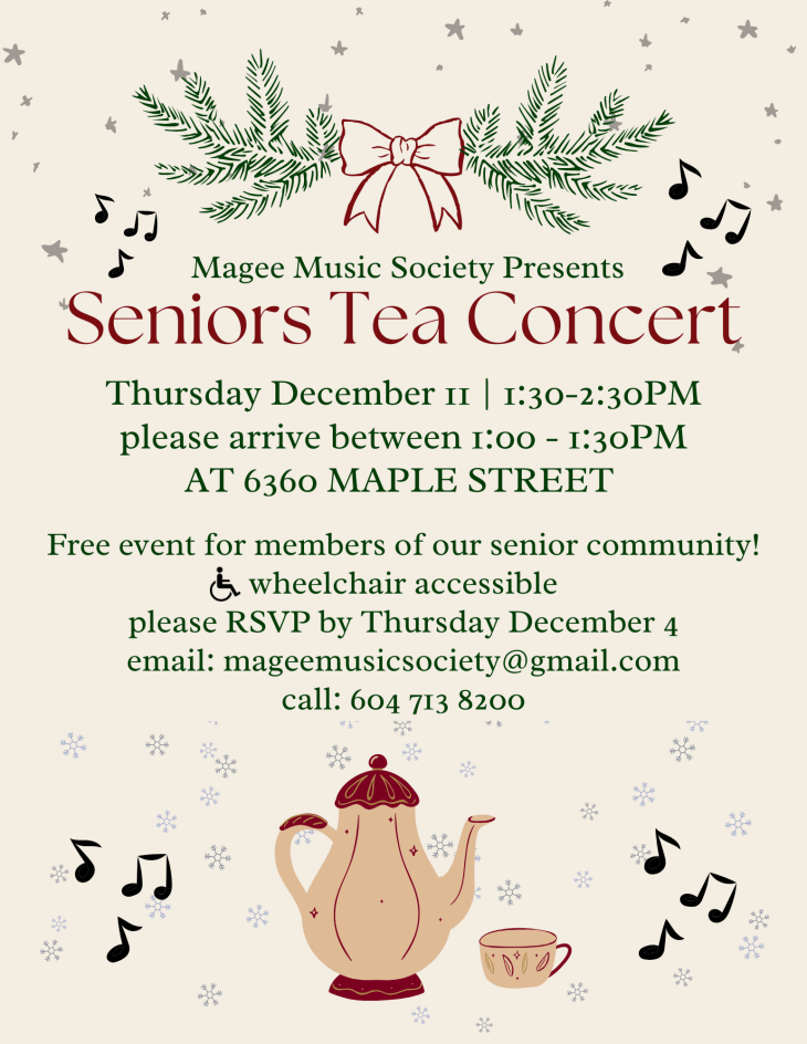 Don’t miss out on bringing some holiday cheer to our senior community! Please RSVP today to reserve a spot for yourself or for a fabulous senior that you know for our annual Senior’s Tea! There will be music and goodies and lots of holiday cheer! Reserve by Thursday December 4th! See you there!